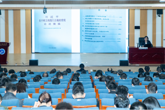 本网讯(通讯员 谭明武 柯贤忠)3月11日上午,学校在流芳校区教育教学综合楼102报告厅举行树立和践行正确政绩观学习教育专题辅导报告会暨党委理论学习中心组(扩大)学习会。中共湖北省委党校李珊珊教授应邀作辅导报告。全体在家校领导出席报告会。报告会由校党委常委、副校长、组织部部长马小龙主持。