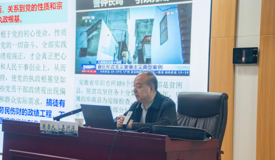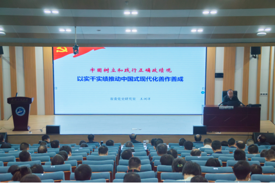 王洲洋以《牢固树立和践行正确政绩观 以实干实绩推动中国式现代化善作善成》为题,从“政绩观问题是一个根本性问题”、“把握正确政绩观的深刻内涵与实践要求”、“习近平率先垂范正确政绩观的崇高风范”、“健全有效防范和纠治政绩观偏差工作机制”、“牢固践行正确政绩观在本职岗位挺膺担当”等五个方面作专题辅导报告。他从“六个关系到”深刻论述了“政绩观问题是一个根本性问题”,从“六个根本”正确把握政绩观的深刻内涵与实践要求,以“八个一”高度概括了习近平率先垂范正确政绩观的崇高风范,并提出健全有效防范和纠治政绩观偏差“五项工作机制”。